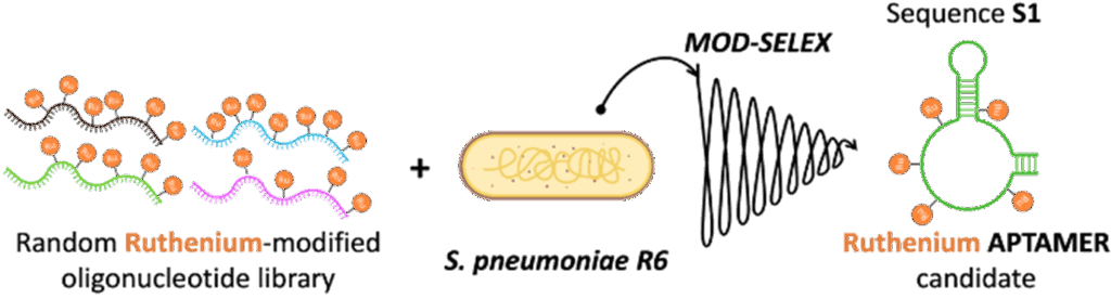 More precisely, this consortium of scientists could first prepare nucleotides equipped with various ruthenium complexes. They then demonstrated that some DNA polymerases could allow synthesising enzymatically oligonucleotides containing these Ruthenium complexes. Through a so-called SELEX experiment, one aptamer was found to have a high affinity (Kd value of 125 nM) for fixed Streptococcus pneumoniae bacteria. Collectively, these results, obtained after 7 years of work of 2 PhD students and one post-doc, highlight the possibility of using nucleotides equipped with large modifications such as ruthenium polypyridyl complexes in SELEX to raise potent aptamers against entire bacterial targets. These findings open directions to convert aptamers into potent devices to combat antimicrobial resistance via PDT-based approaches.