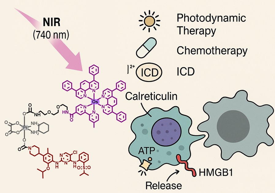 This consortium of researchers has successfully prepared a new conjugate combining an osmium complex, a platinum complex, and ceritinib, an approved cancer drug. This strategy combines three complementary actions within a single drug to enhance its therapeutic efficacy: 1) photodynamic therapy, 2) controlled release of a chemotherapy agent, and 3) induction of immunogenic cell death (ICD). When activated by light, the conjugate produces reactive oxygen species, generating local toxicity for cancer cells, while releasing a platinum derivative active against cancer cells. At the same time, they trigger biological signals characteristic of immunogenic cell death, promoting the recognition of tumor cells by the immune system. Promising results have been obtained in the laboratory on spheroid models of ovarian cancer, demonstrating that this conjugate reduces the growth of these tumor models while inducing immunotherapeutic responses. This integrated approach opens new perspectives for developing more effective therapies for resistant cancers.